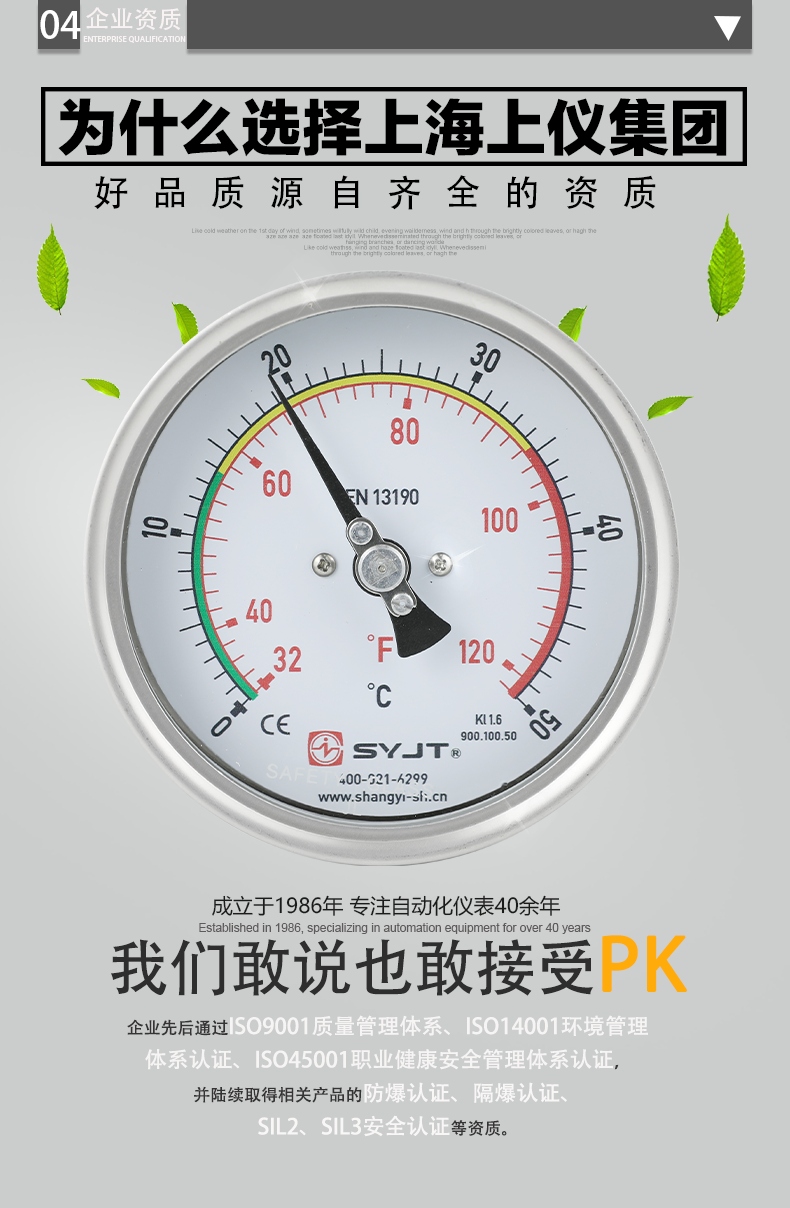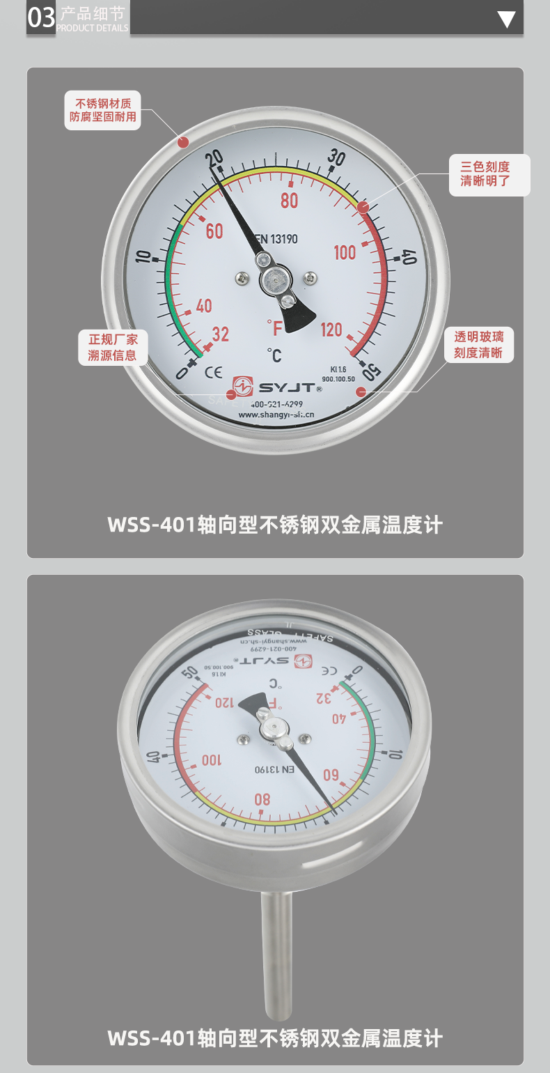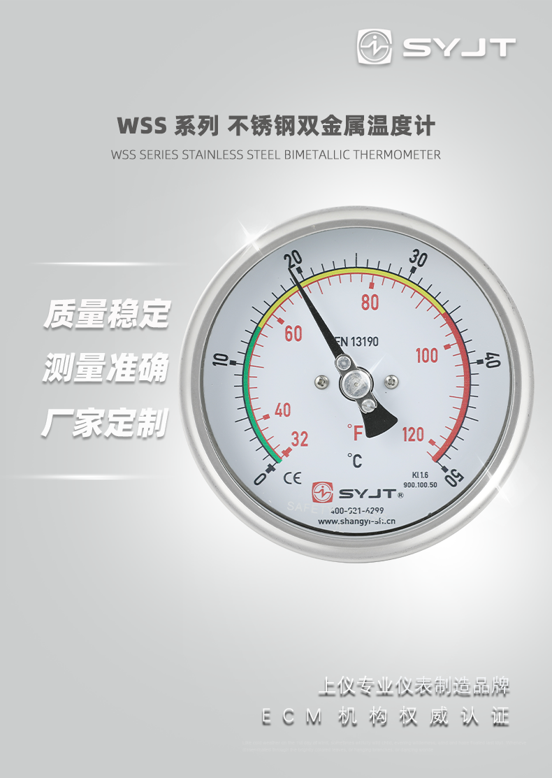 WSS不鏽鋼(gāng)雙金屬溫度計軸向型,本廠生產的雙金屬溫度計其保護管、節頭、鎖(suǒ)緊(jǐn)螺栓等均采用1Cr18Ni9Ti材料(liào),表殼采(cǎi)用鋁板拉伸成型經切削加工表麵黑(hēi)色電(diàn)泳(yǒng)處理,表蓋與表盒采用環型雙層橡膠圈螺紋密封鎖(suǒ)緊結構,故(gù)儀表整體防水防腐性能(néng)良好,徑向(xiàng)型儀表采用(yòng)彎管型結構(gòu),外型新穎、輕巧···