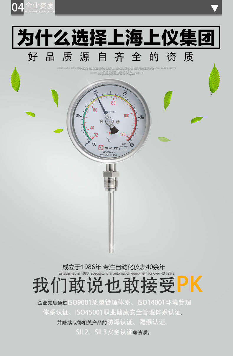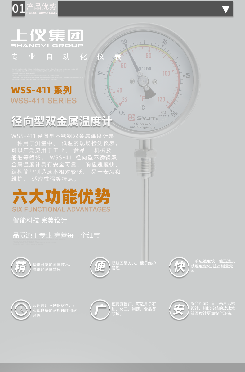 WSS 不鏽鋼雙金屬溫度計(jì) 徑(jìng)向型,本廠生產的雙金屬溫度計其保護(hù)管、節頭、鎖緊螺栓等均采用1Cr18Ni9Ti材料,表殼采用鋁板拉伸成型經切削加工表麵黑色電泳處理(lǐ),表蓋與表盒采用環型雙層橡膠(jiāo)圈螺紋(wén)密封鎖(suǒ)緊結構,故儀表整體防水防腐性能良好,徑向型儀表(biǎo)采用(yòng)彎管(guǎn)型結構,外型新穎(yǐng)、輕···