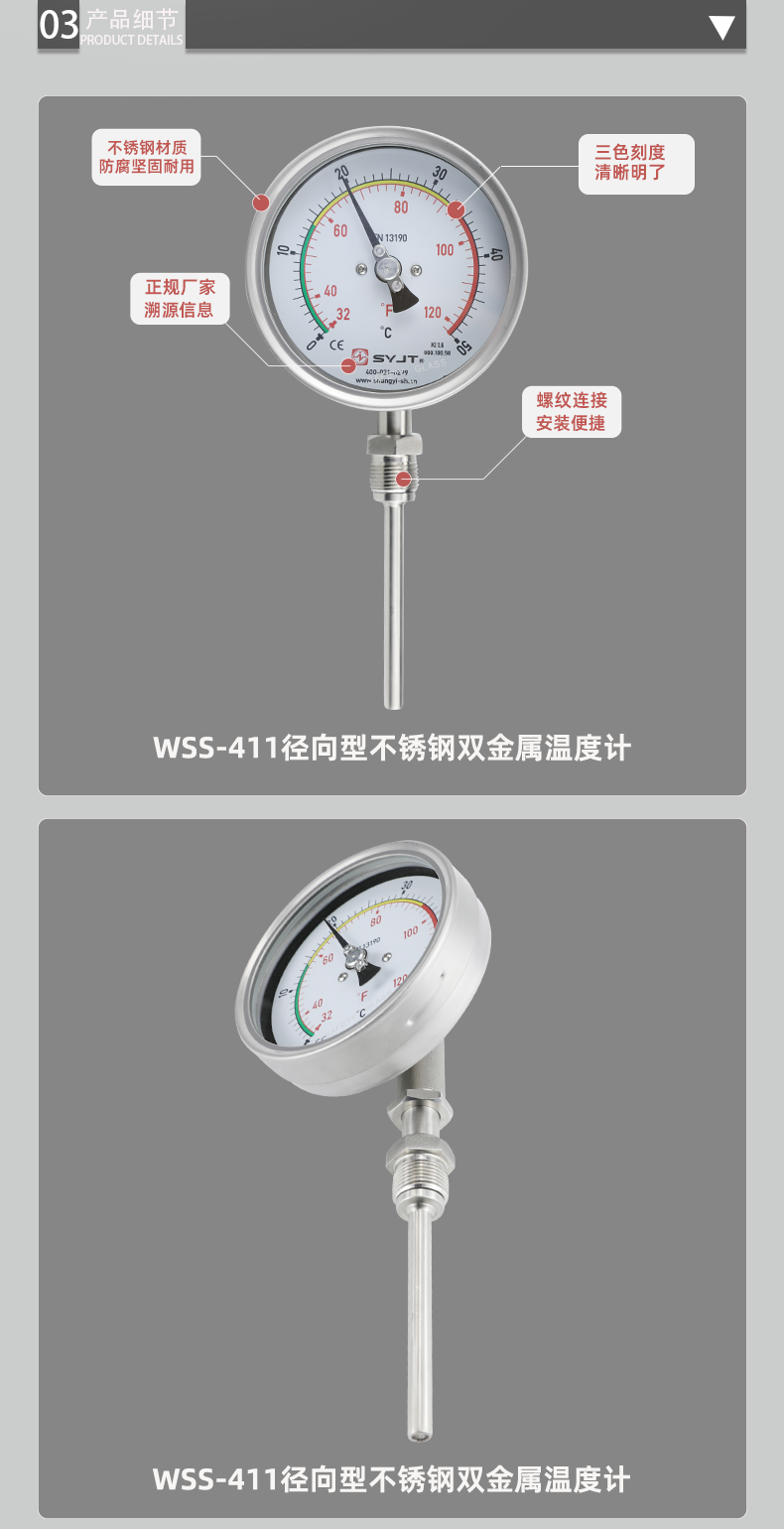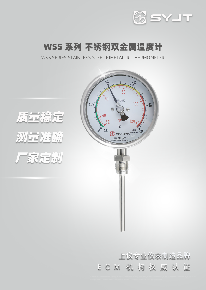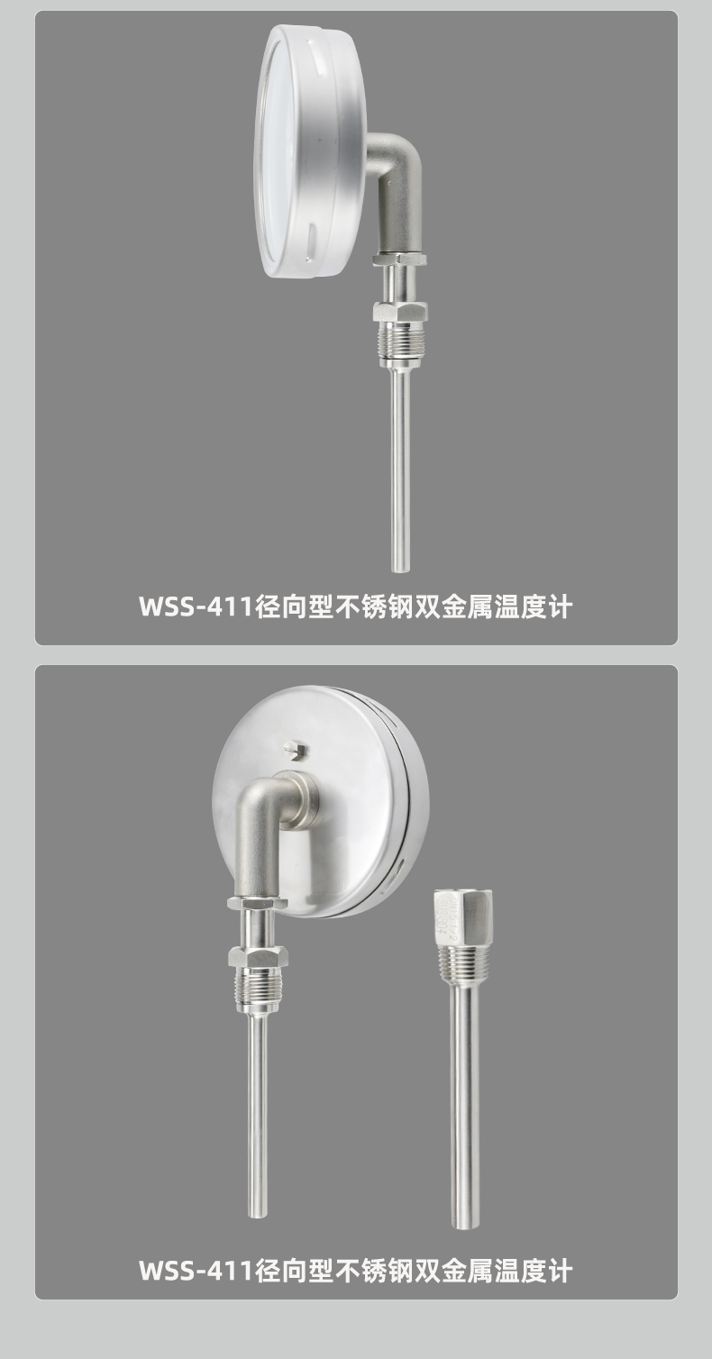 WSS 不鏽鋼雙金屬溫度計 徑向型,本廠生產的雙金屬溫度計(jì)其(qí)保護管、節(jiē)頭、鎖緊螺栓(shuān)等均(jun1)采用1Cr18Ni9Ti材料,表殼采用鋁板拉伸成型經切削加工表麵黑色電泳處理,表蓋(gài)與表盒采用(yòng)環型雙層橡膠圈螺紋密封鎖緊結構,故儀表整體防水防腐性能良好,徑向型儀表采用彎管型結構,外型新穎、輕巧、美觀與眾不同。
