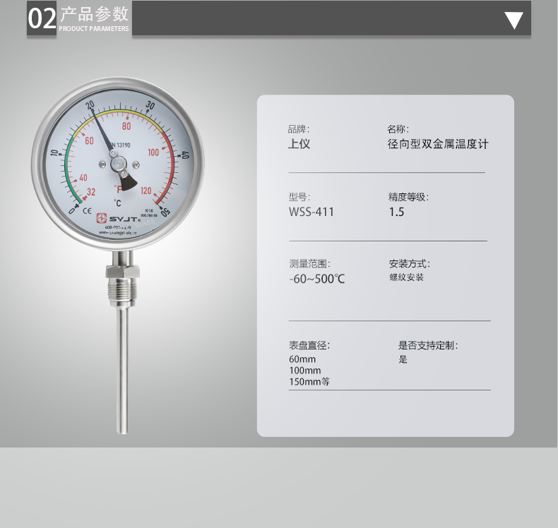 溫度計指示部分(fèn):(按溫度計標度盤的外徑表示)分φ60、φ100、φ150mm.