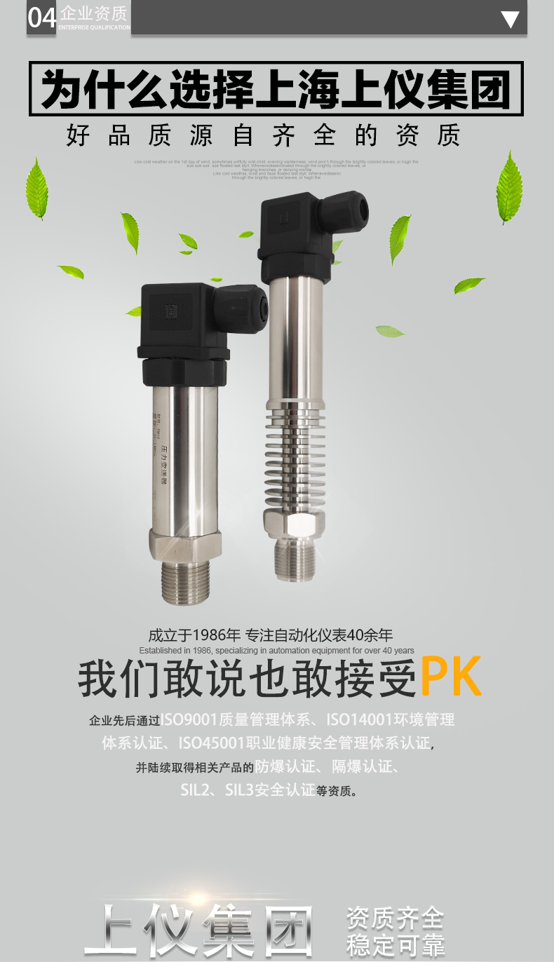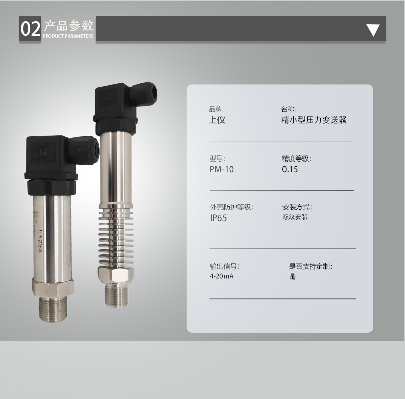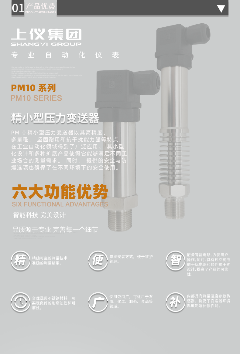 PM10-基(jī)本型壓力變送器係列小型化壓力變送器具有多種型號,多種量程,多種過程連接形式及材料。可廣泛(fàn)用於石油、化工、電力、冶(yě)金(jīn)、製(zhì)藥(yào)、食品(pǐn)等許多(duō)工業*域,可(kě)適應工業測量的(de)各種場合及介質,是傳統壓力表及傳統壓(yā)力變送器的理想升***換代產品,是工業自動化*域理想(xiǎng)的(de)壓(yā)力測量儀表。